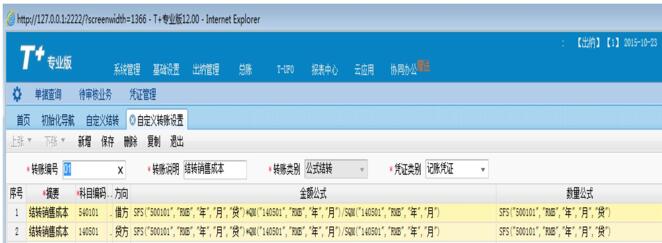 2、在表體中,科目列第一行選擇“主營業(yè)成本“,方向“借方“,第二行選擇“庫存商品“科目,方向”貸方“,點擊數(shù)量公式列,兩行數(shù)量公式中都錄入SFS(“500101”,”RMB”,”年”,”月”,”貸”);